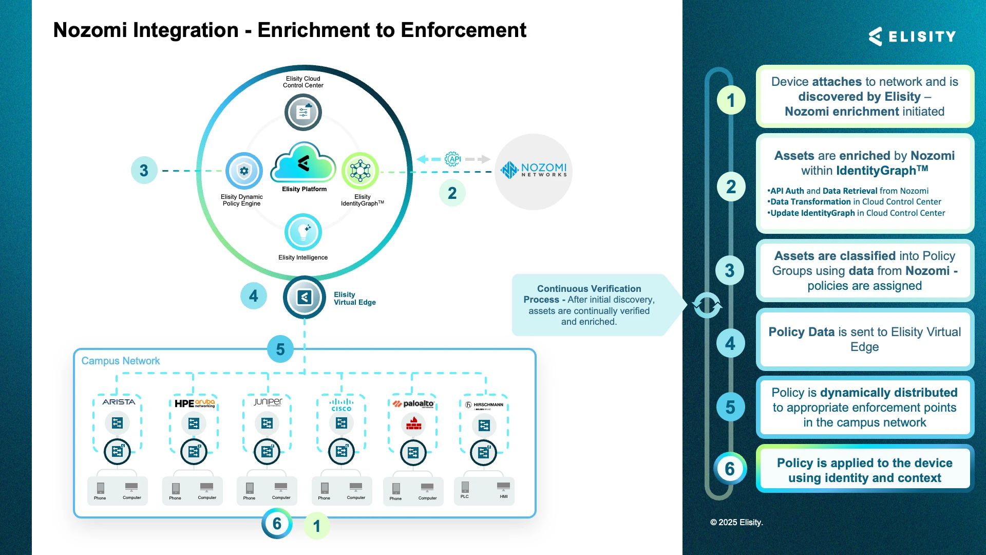 Integration with Nozomi gives Elisity unmatched insight into assets and traffic flows, uncovering hidden devices and continuously monitoring for threats. This visibility is critical for identifying vulnerabilities and ensuring a secure, resilient network environment.