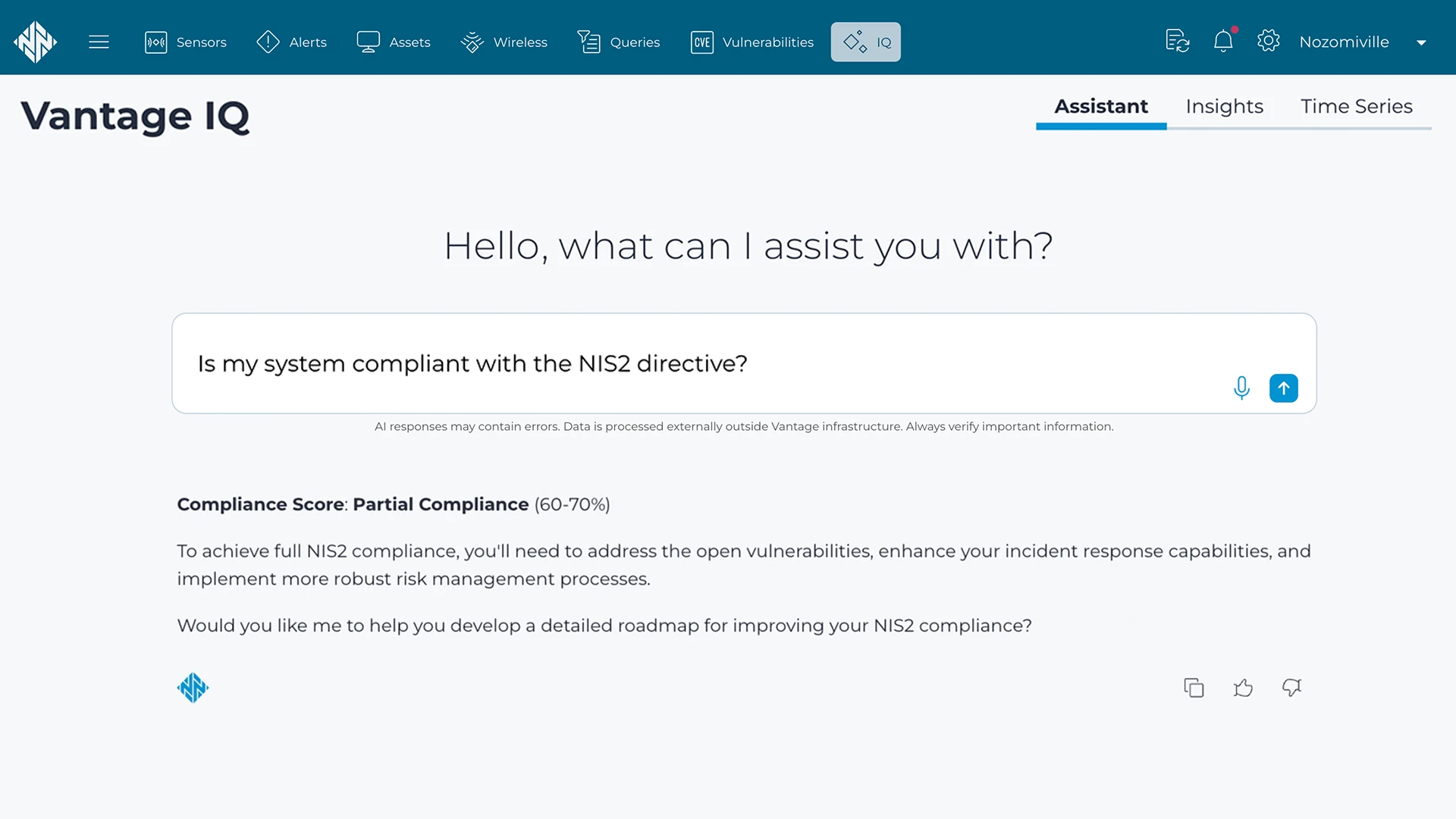 Vantage IQ Assistant provides instant answers to complex, plain-language questions that help you close security gaps and optimize your environment. It works just like a commercial chatbot but is trained on your environment, using the Nozomi Networks LLM and AI engine.